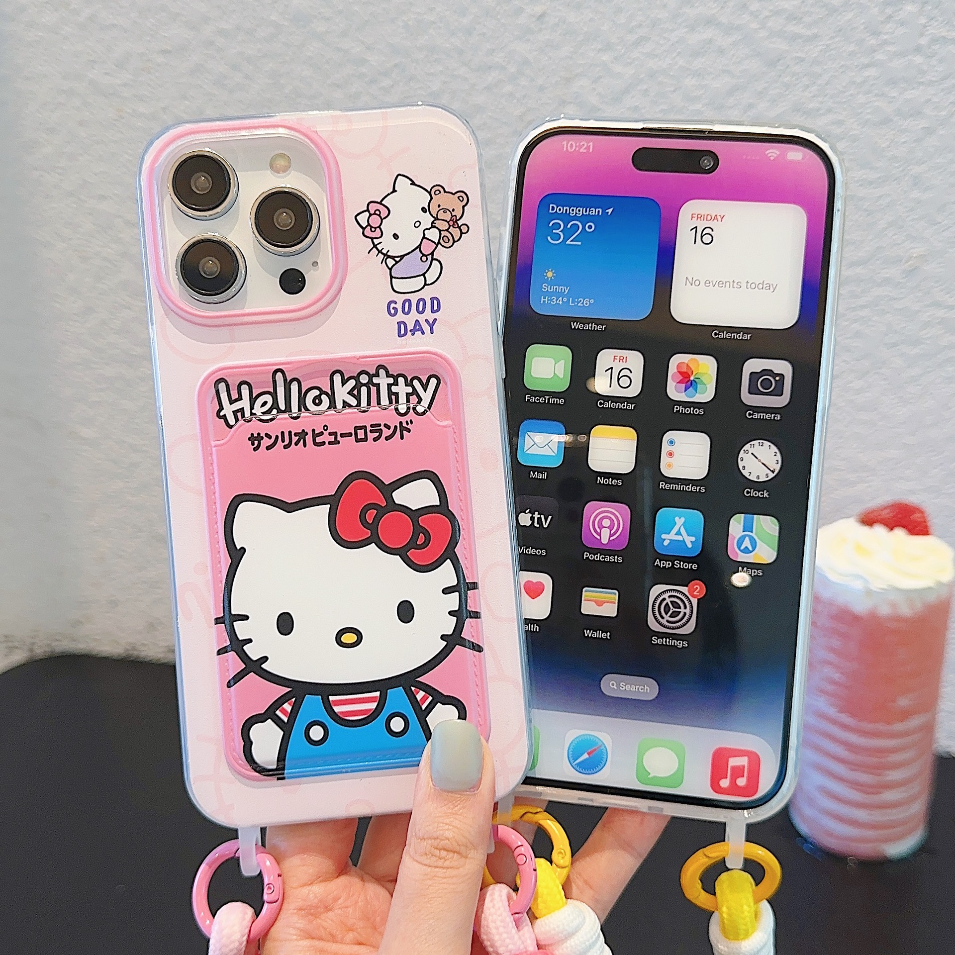 Accessories for Apple 15iPhone14Pro cute 13promax cartoon card bag lanyard kitty cat Internet celebrity soft case