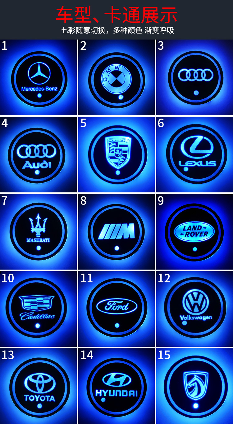 (Free shipping) Full brand Car LED light water coaster Colorful water coaster Car atmosphere light USB charging Non-slip mat