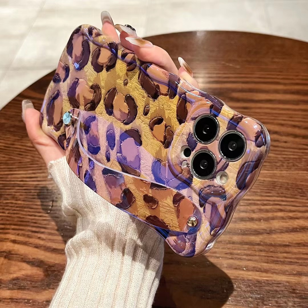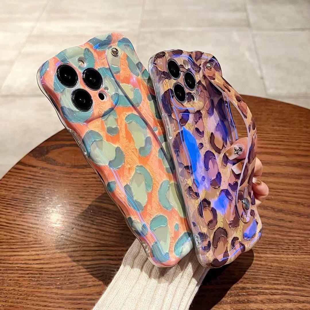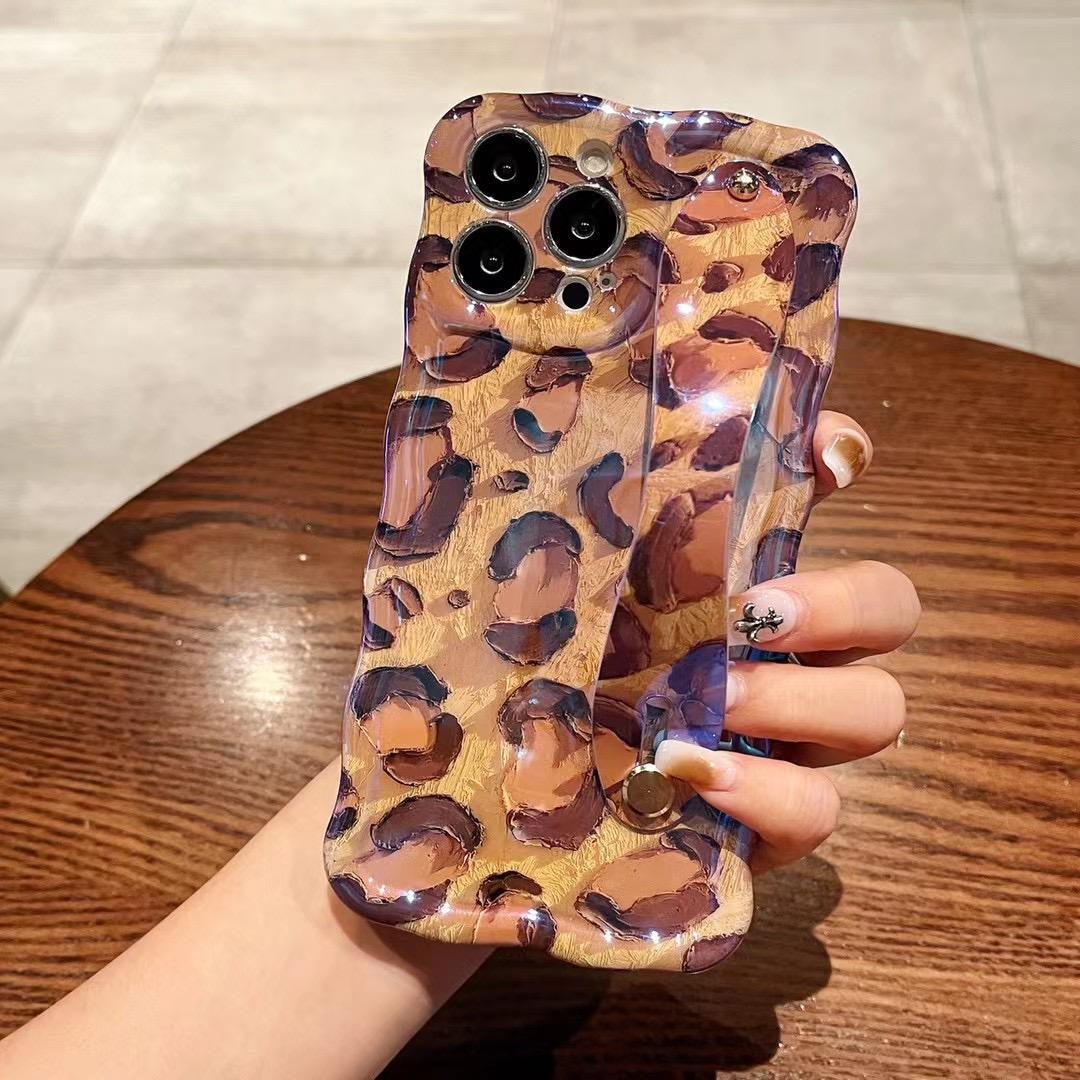 Accessories iPhone15Pro/Apple 14Promax anti-drop blue light wavy edge oil painting leopard print wristband new female phone case