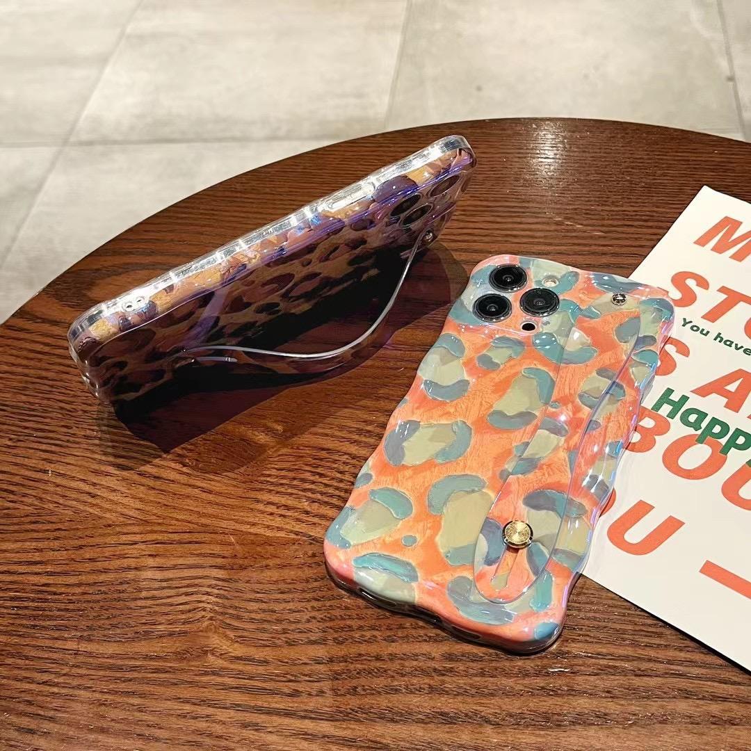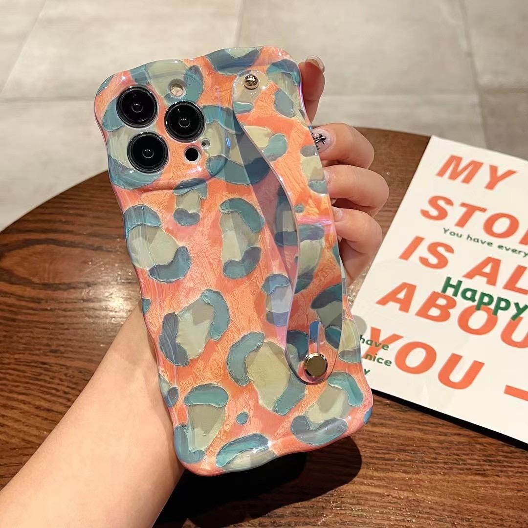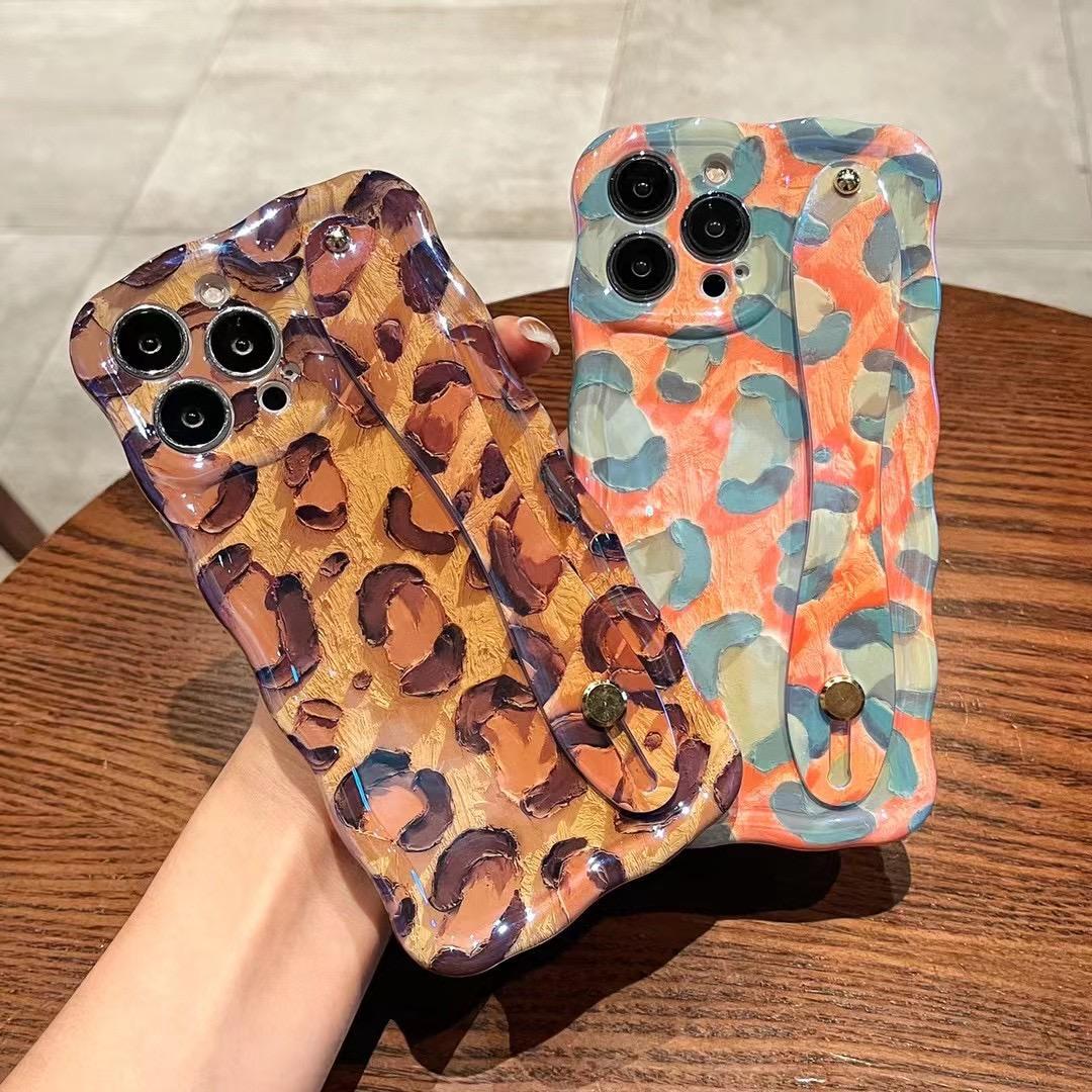 Accessories iPhone15Pro/Apple 14Promax anti-drop blue light wavy edge oil painting leopard print wristband new female phone case